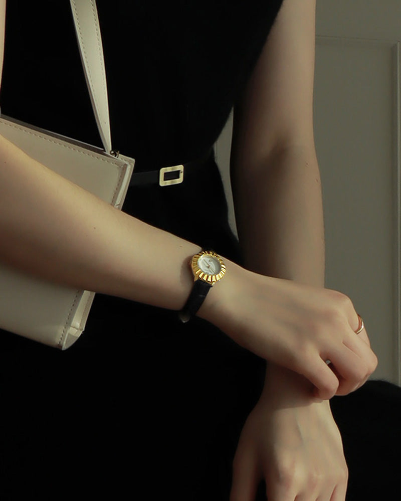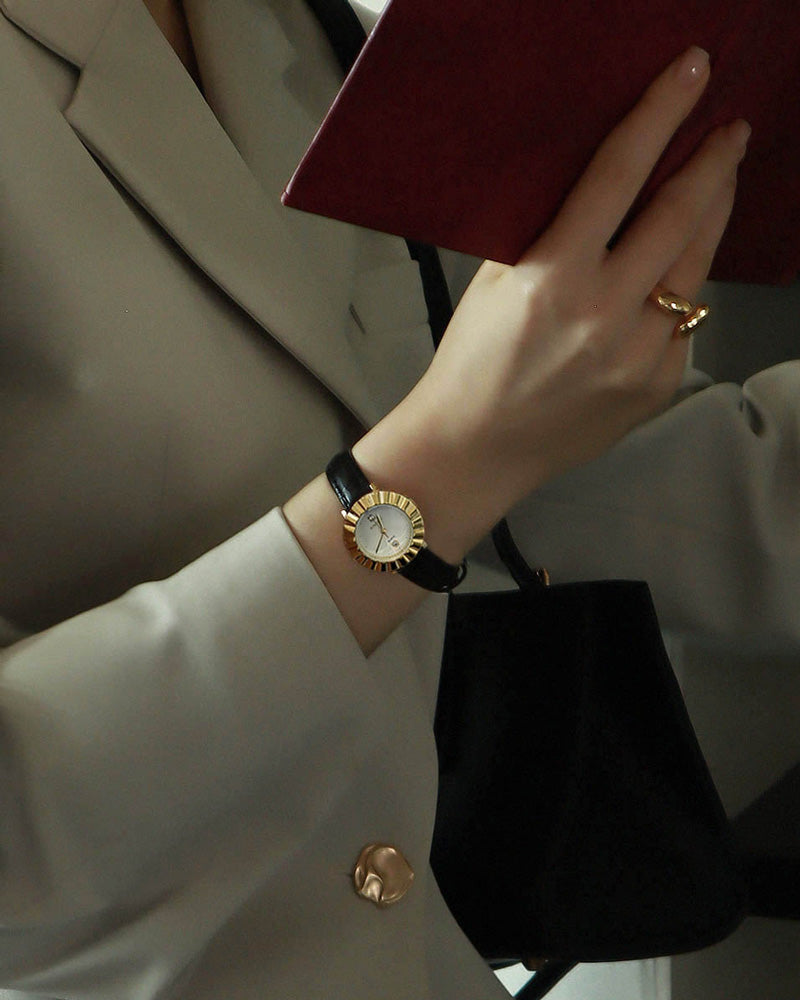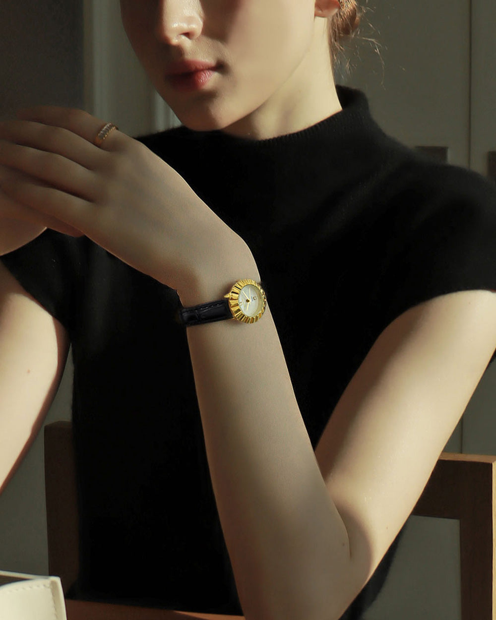 The RUMTTON BLOOM watch features Swarovski crystals on the dial and 20 wavy bezels for a luxurious look. The comfortable leather band and special design make the BLOOM watch a highly collectible item.