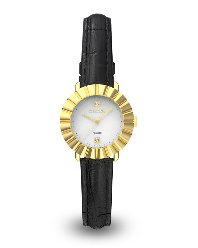 Circle shape Crystal deco Women's Black leather band watch BLOOM Gold