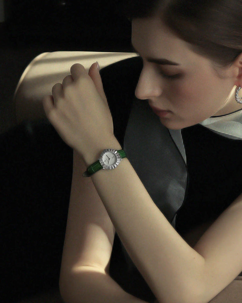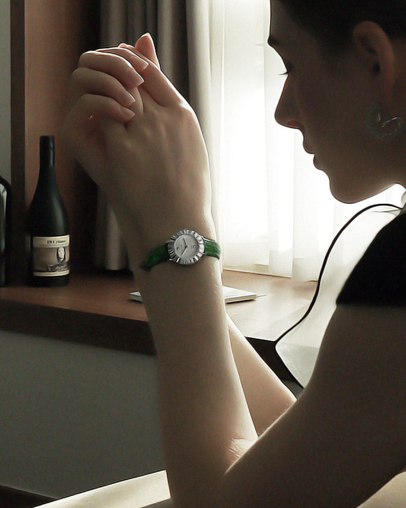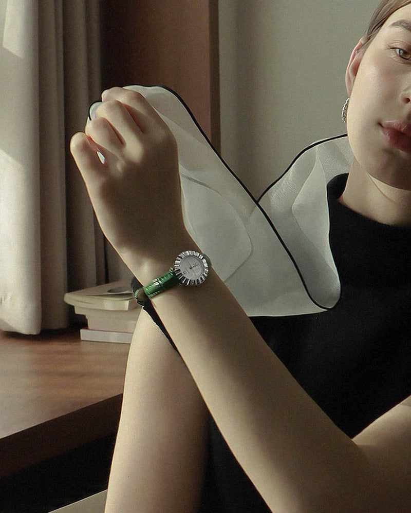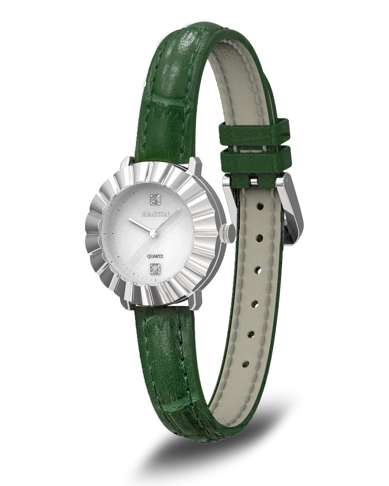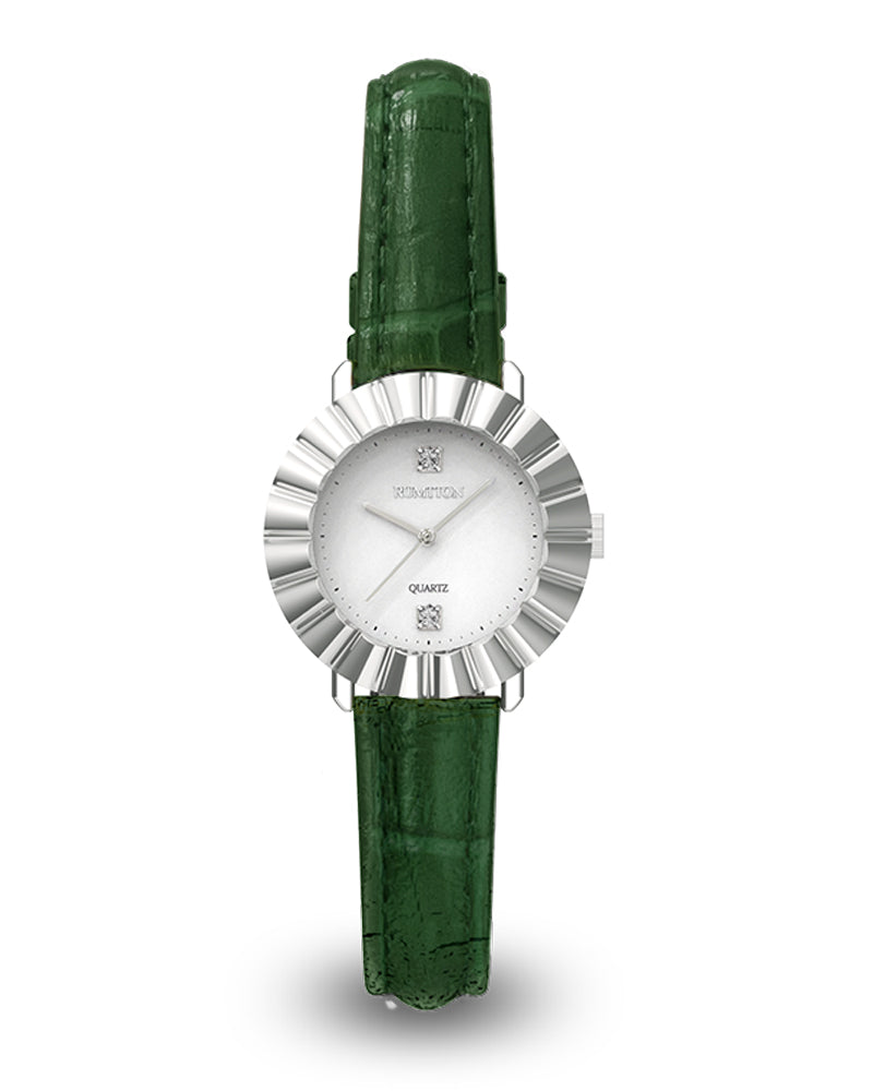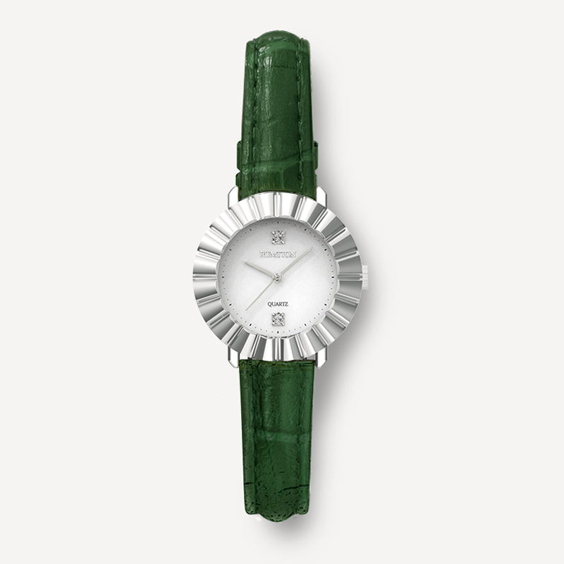 Circle shape Crystal deco Women's Green leather band watch BLOOM Silver