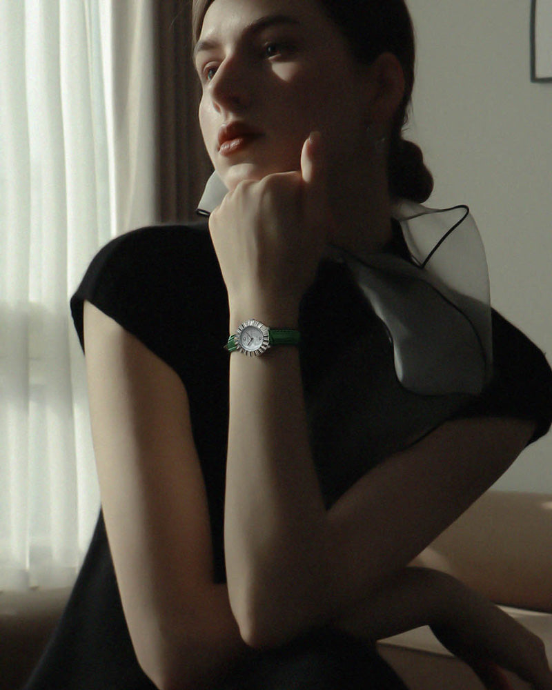 The RUMTTON BLOOM watch features Swarovski crystals on the dial and 20 wavy bezels for a luxurious look. The comfortable leather band and special design make the BLOOM watch a highly collectible item.