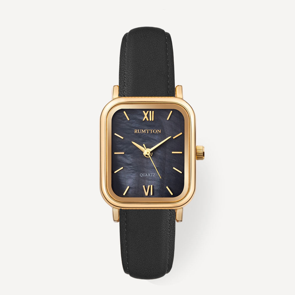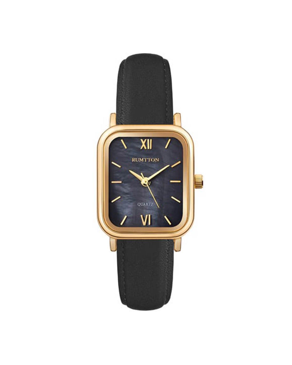 RUMTTON HARBOR Black Gold Women's Black Mother-of-Pearl Leather Watch
