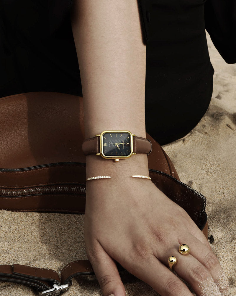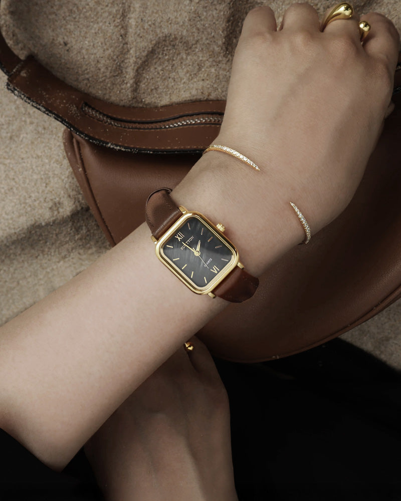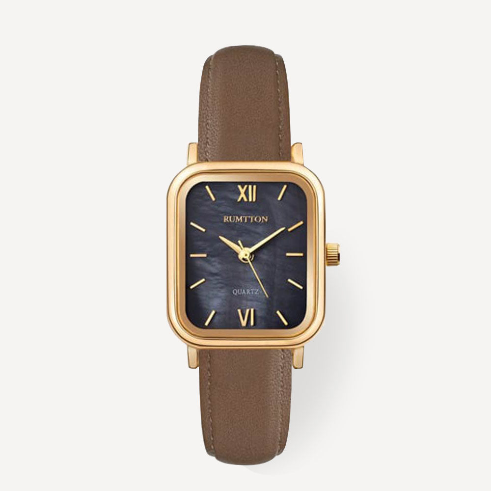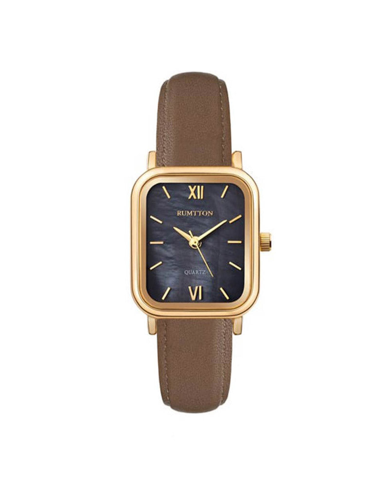 RUMTTON HARBOR Brown Gold Women's Black Mother-of-Pearl Leather Watch