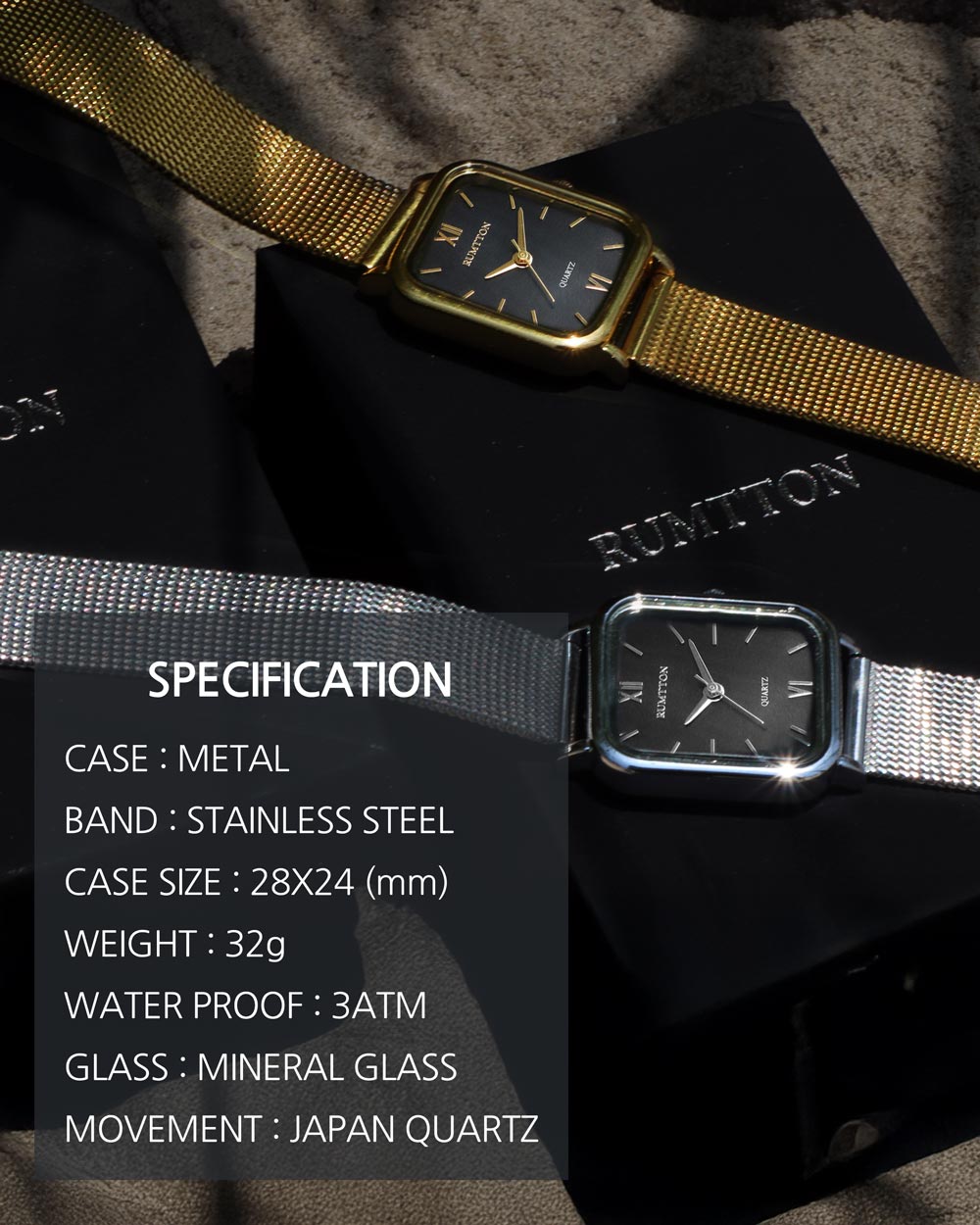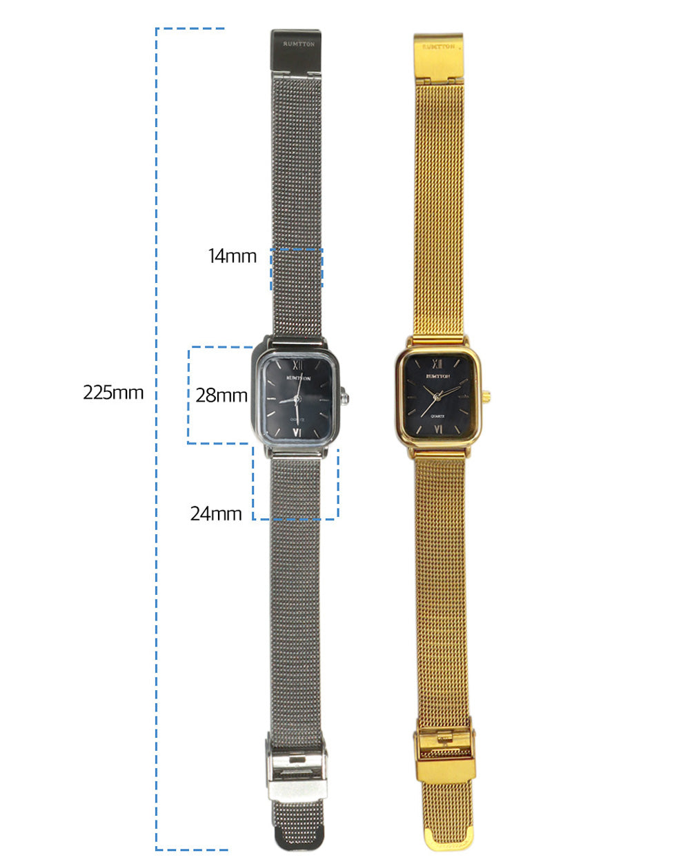 The RUMTTON HARBOR Gold watch features a luminous black mother-of-pearl dial that adds a touch of sophistication to your look. The comfortable mesh band makes it a versatile enough for any occasion. This timeless design is perfect for everyday wear.