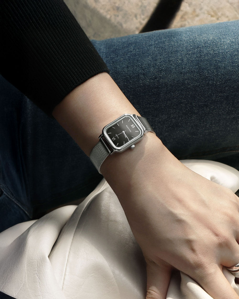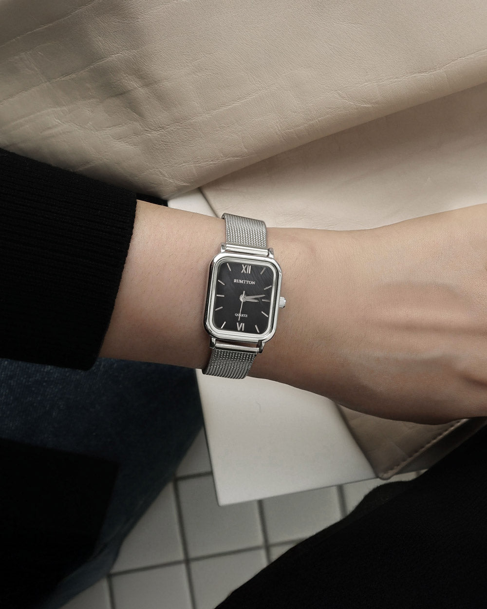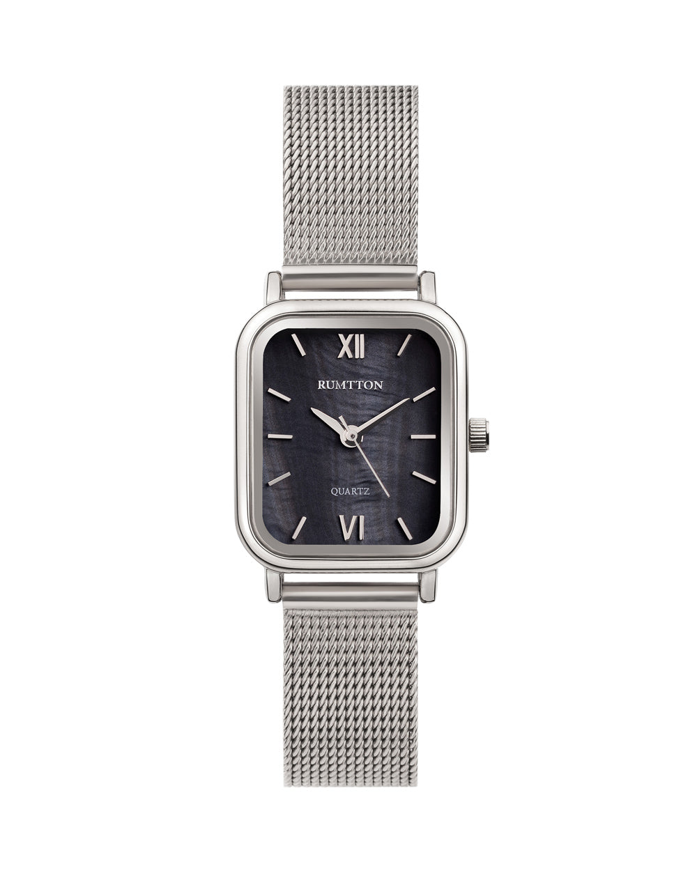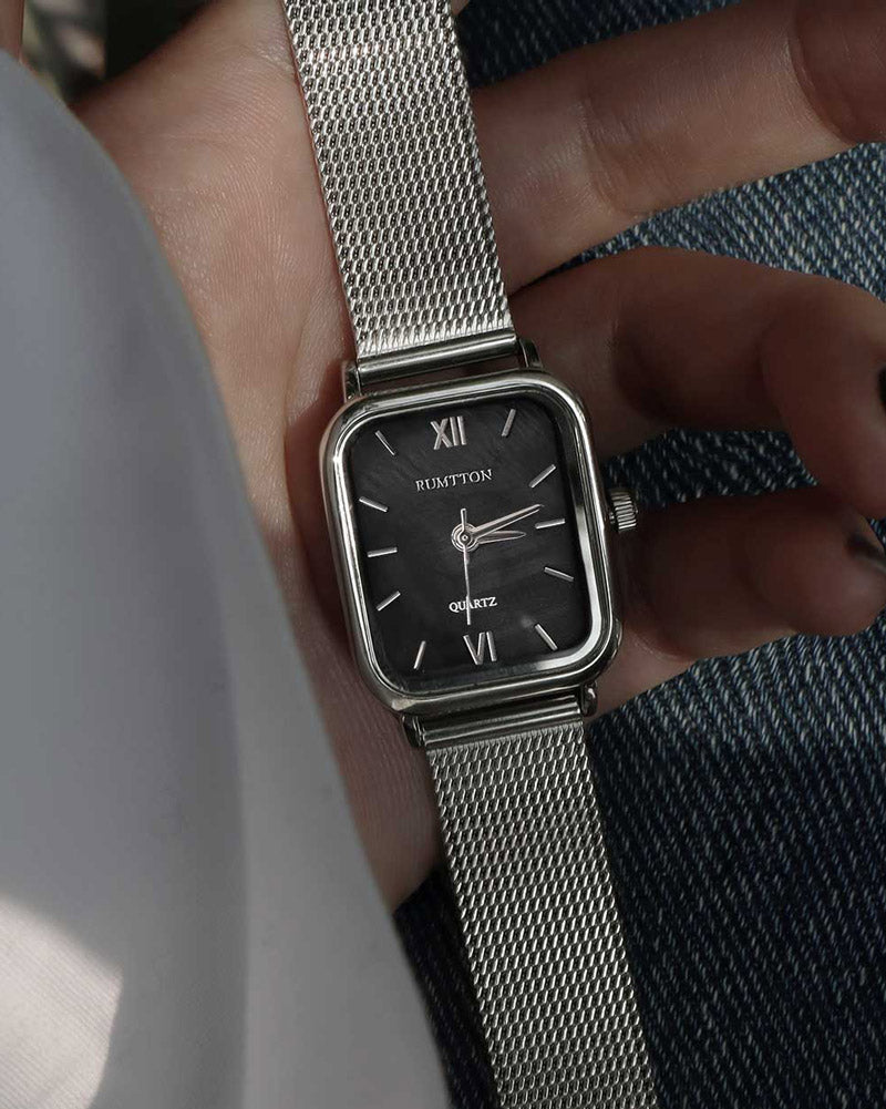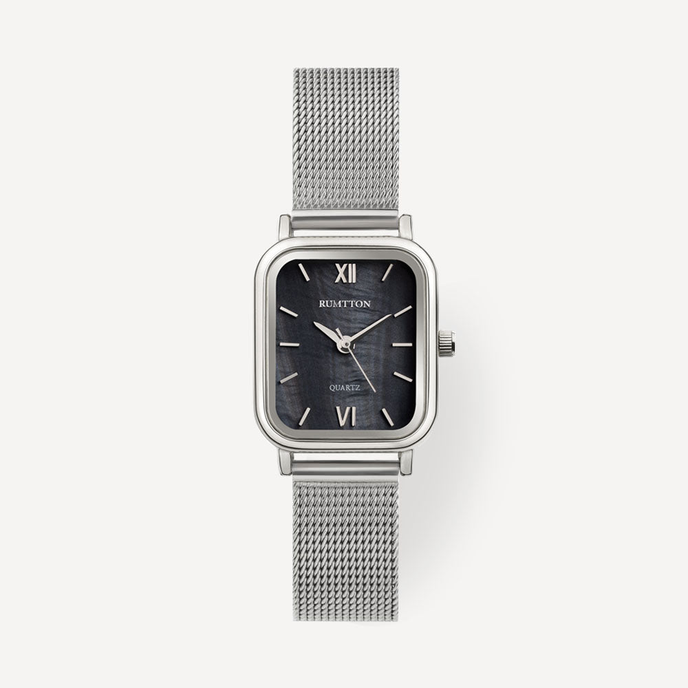 RUMTTON HARBOR Silver Women's Mesh Watch with Black Mother-of-Pearl Dial