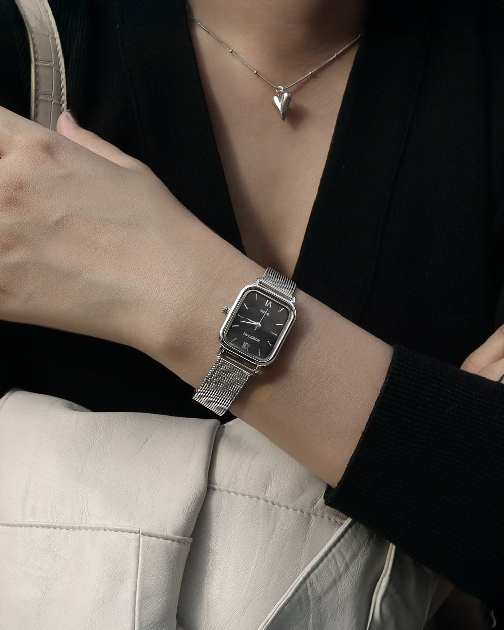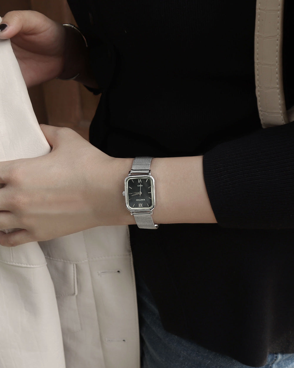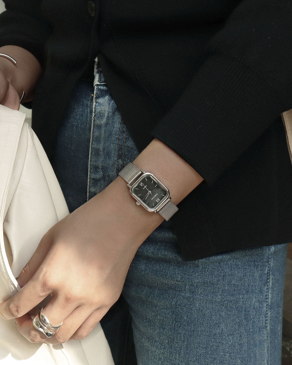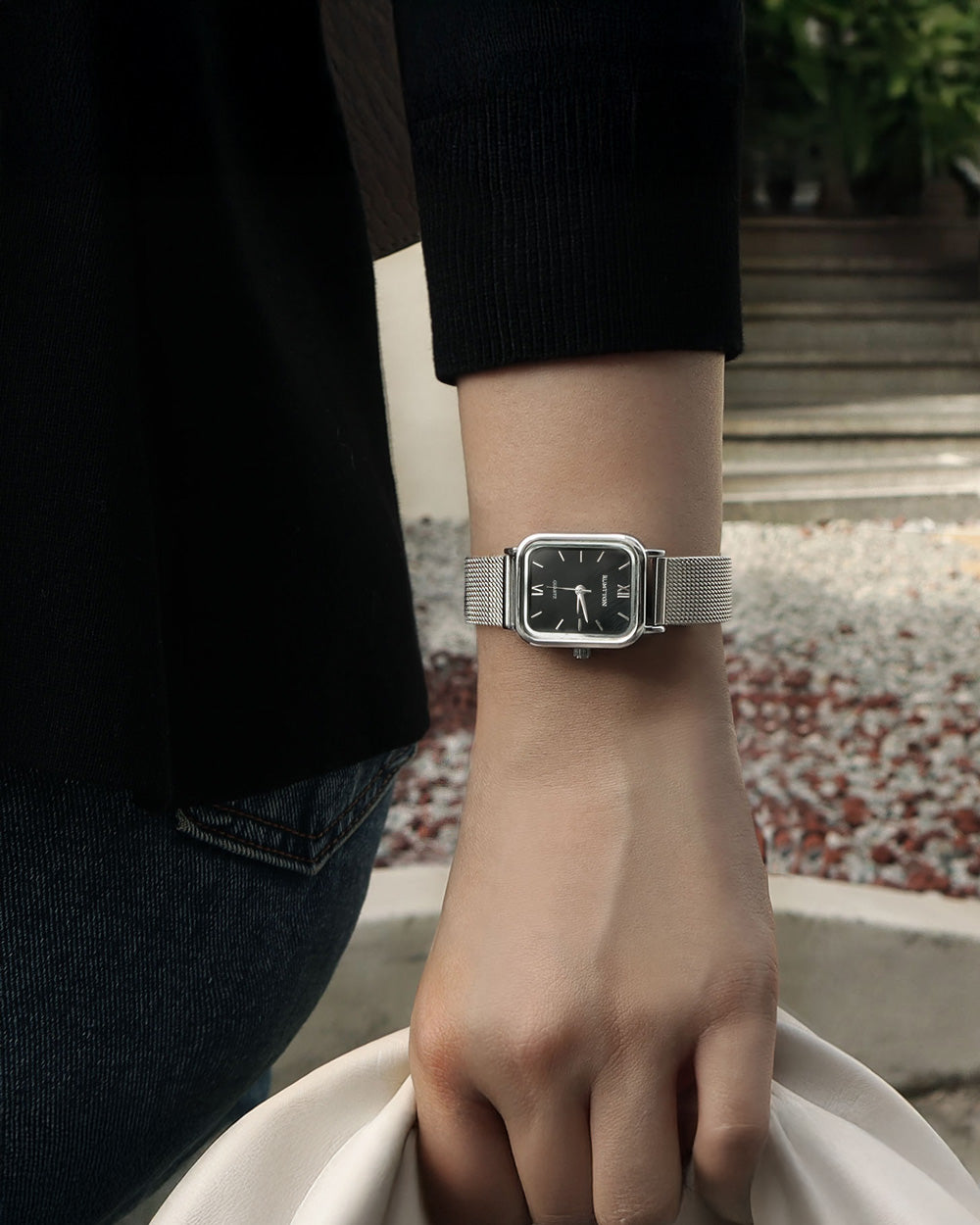 RUMTTON HARBOR Silver Women's Mesh Watch with Black Mother-of-Pearl Dial