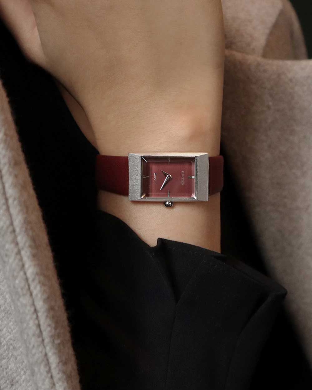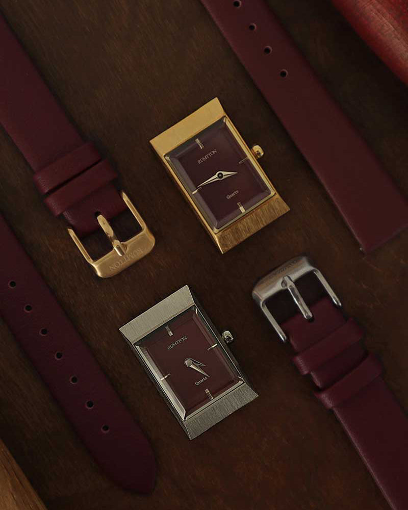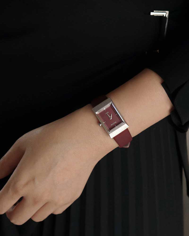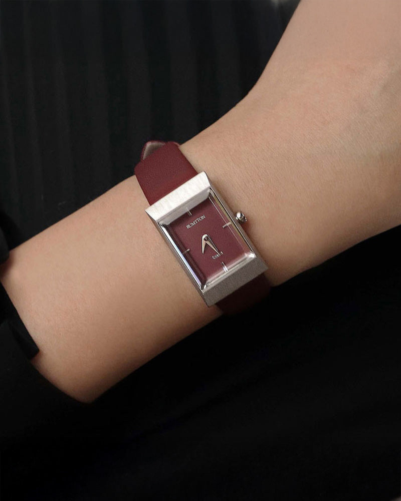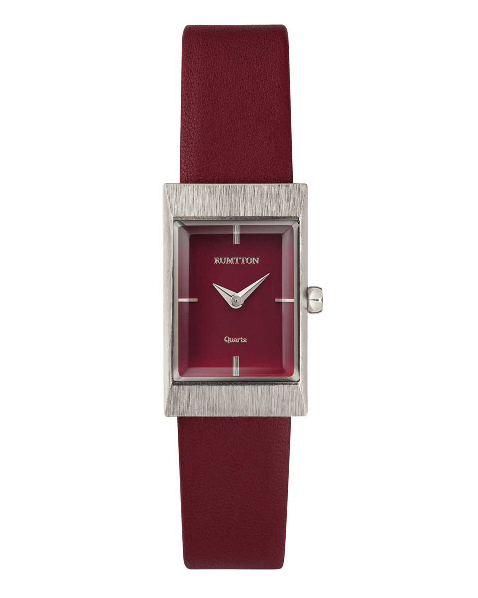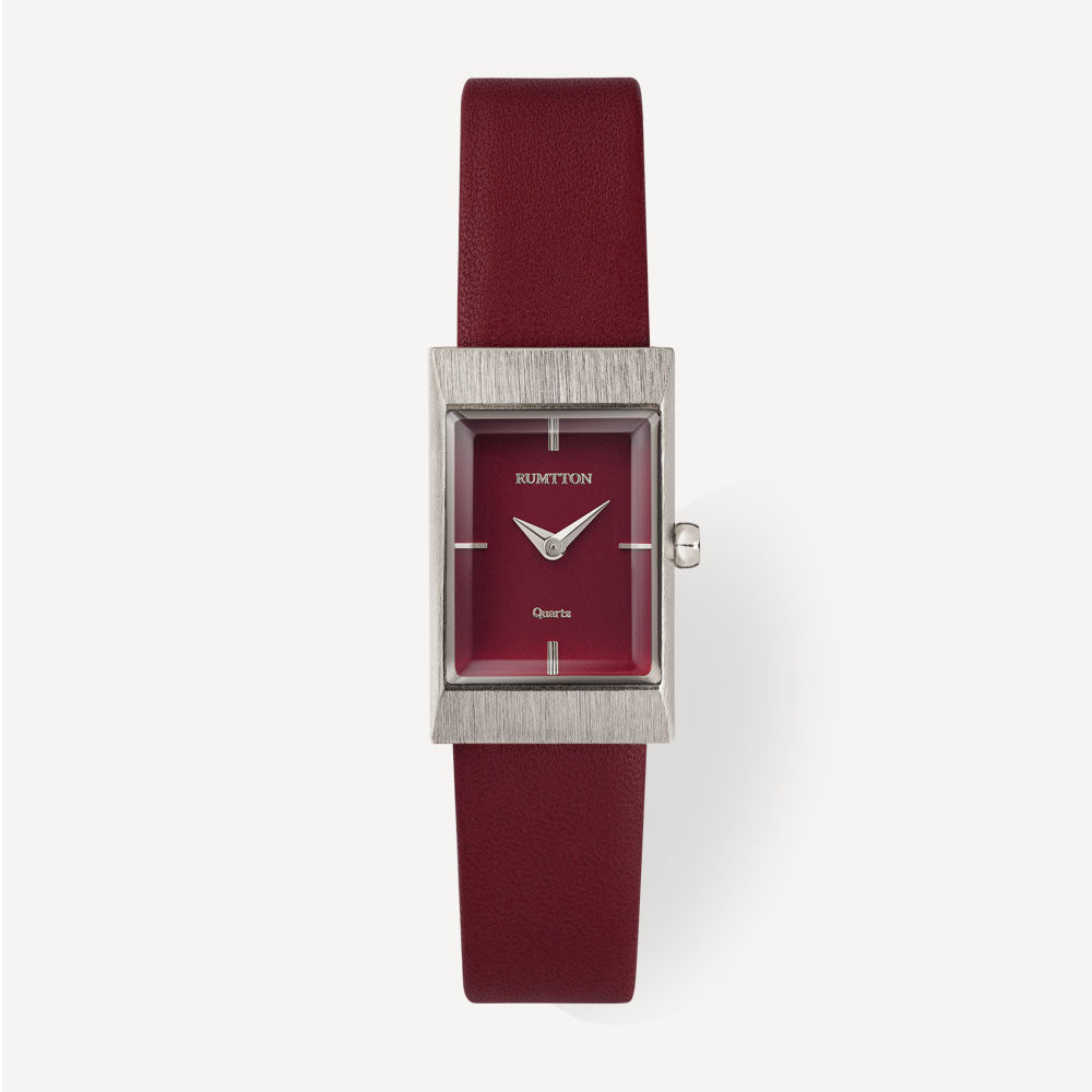 RUMTTON GRID Bugundy Silver Square Leather Watch