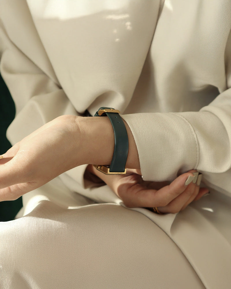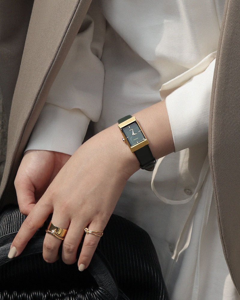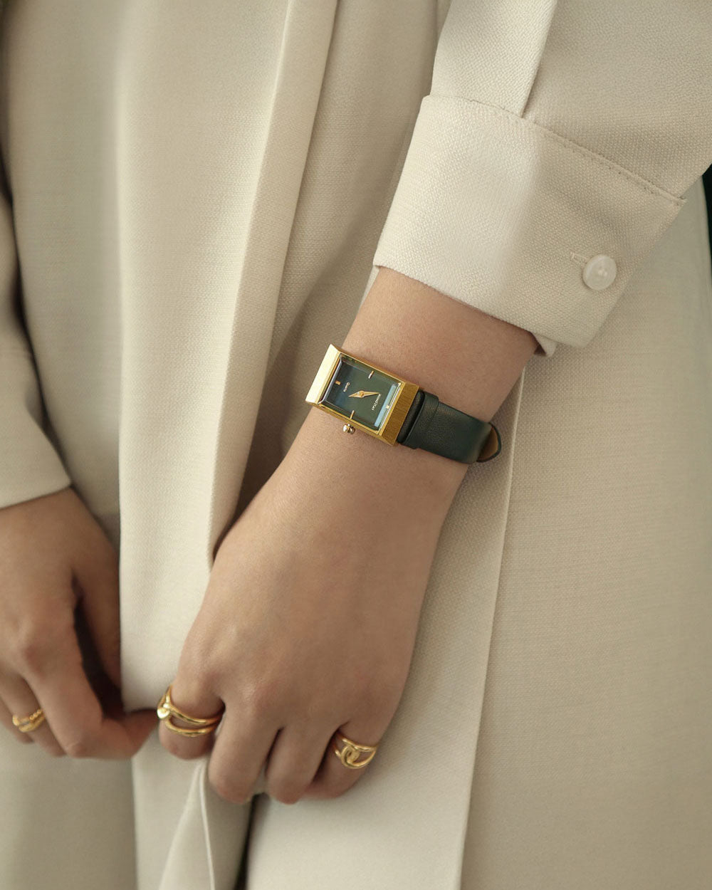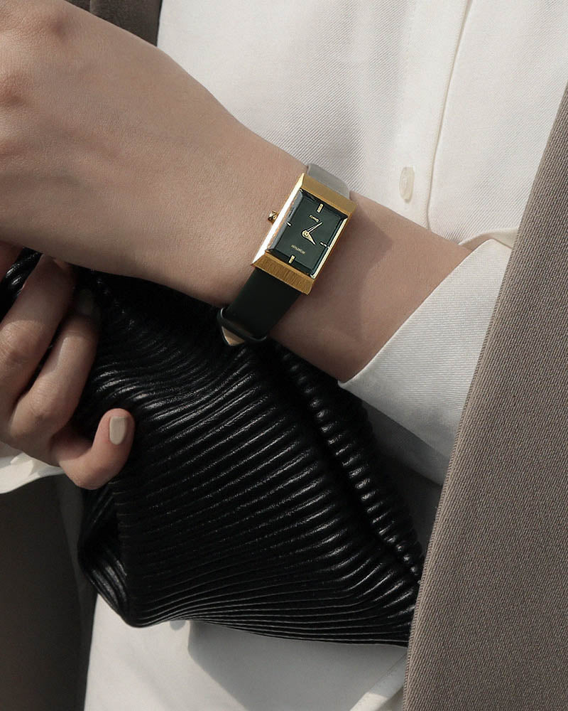 The RUMTTON GRID watch features a captivating interplay between the thick glass and the hairline-finished case. The natural leather band, with its unique softness and rich color, adds a touch of timeless elegance, making this watch a perfect choice for special occasions.