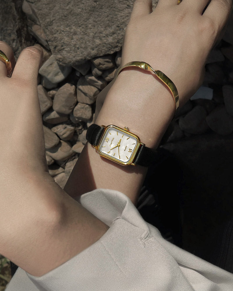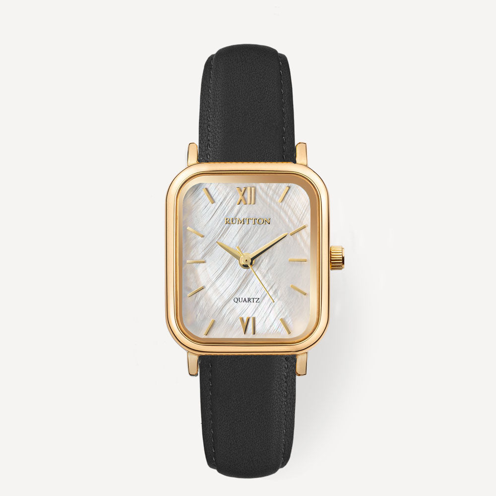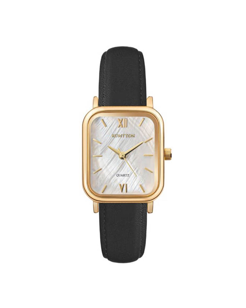 RUMTTON HARBOR Black Gold Women's White Mother-of-Pearl Leather Watch