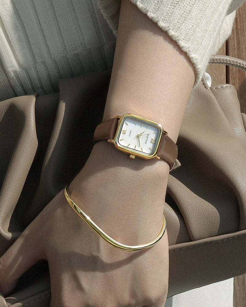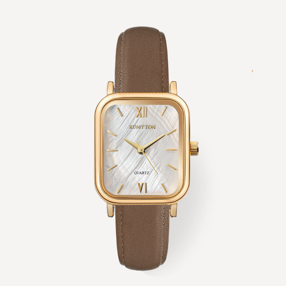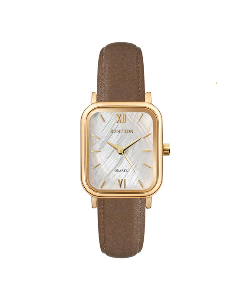 RUMTTON HARBOR Brown Gold Women's White Mother-of-Pearl Leather Watch