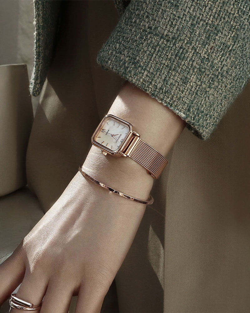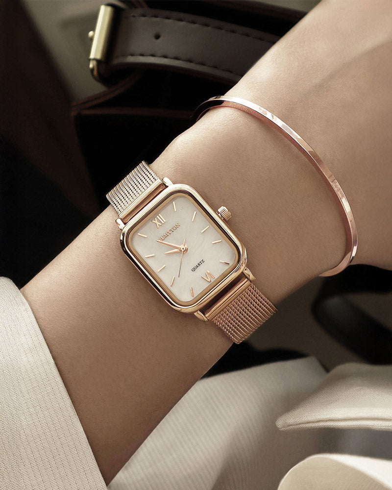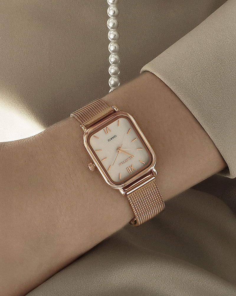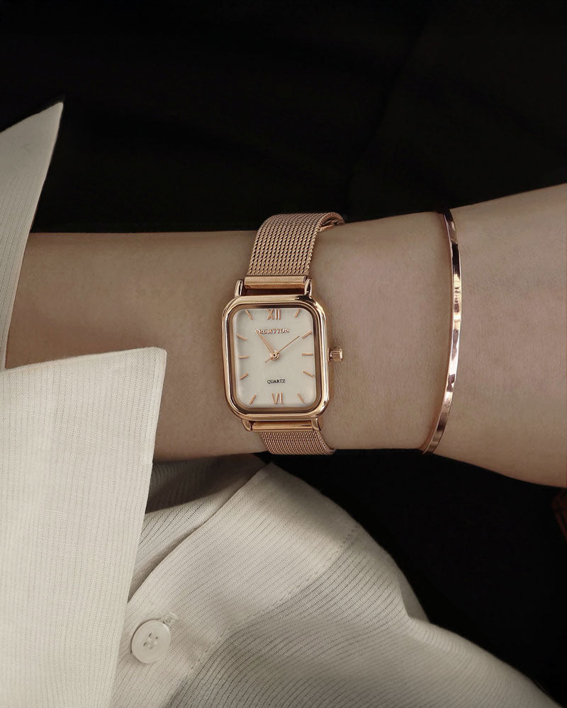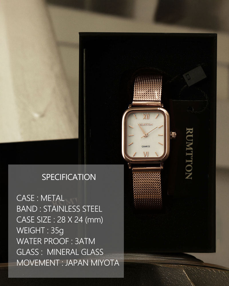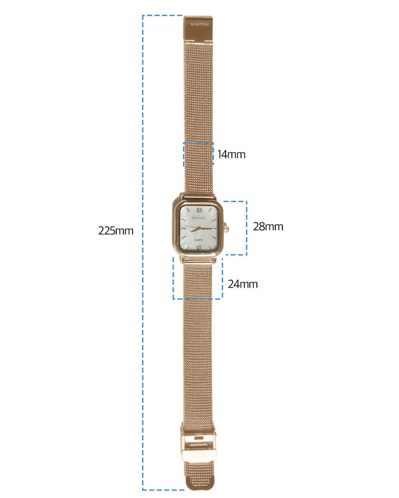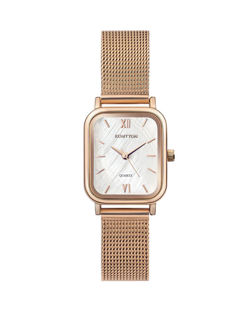 The RUMTTON HARBOR Rose Gold watch features a luminous white mother-of-pearl dial that adds timeless elegance to any ensemble. The comfortable mesh band ensures effortless style for everyday wear.