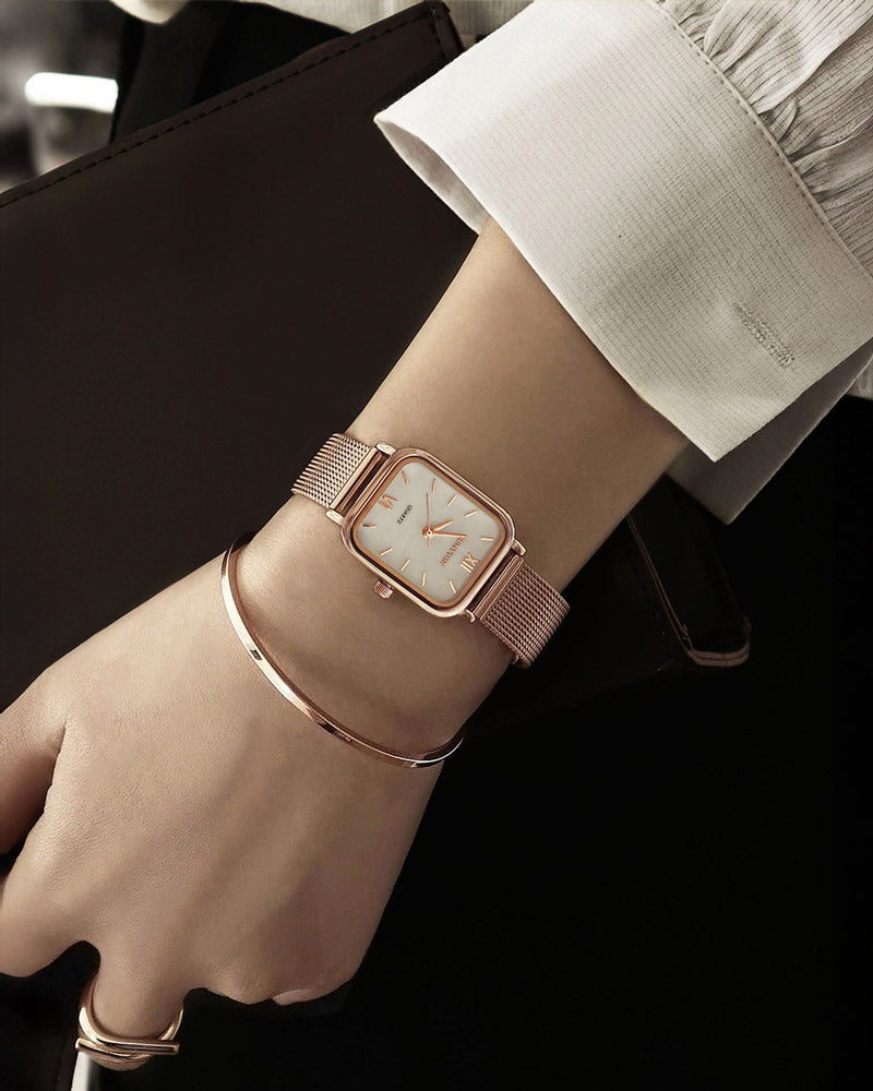RUMTTON HARBOR Rose Gold Women's Mesh Watch with White Mother-of-Pearl Dial