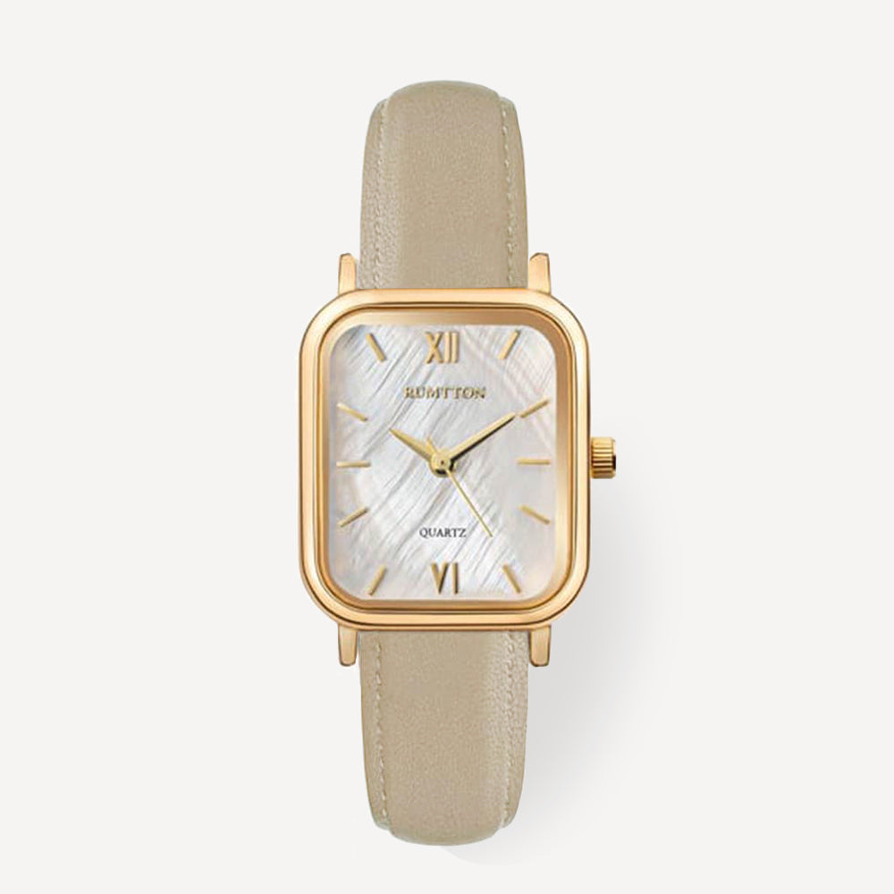 RUMTTON HARBOR Gold Women's White Mother-of-Pearl Leather Watch