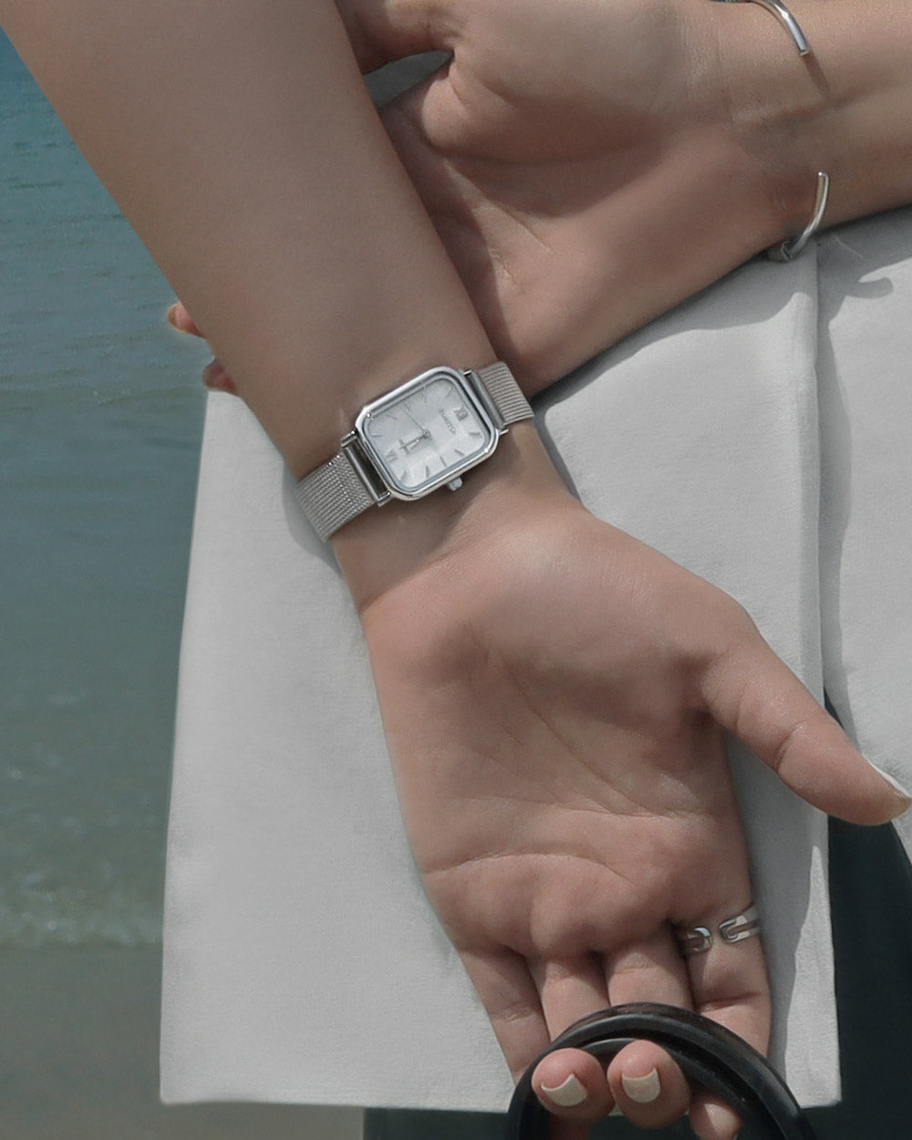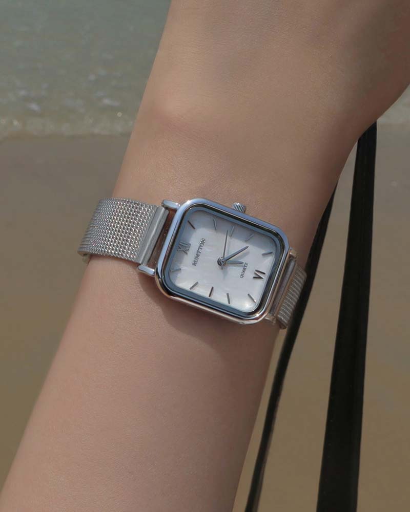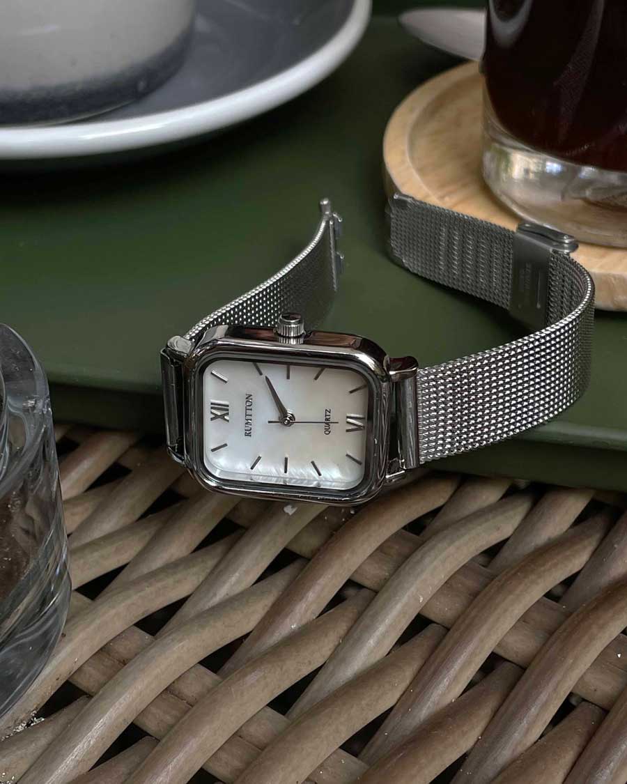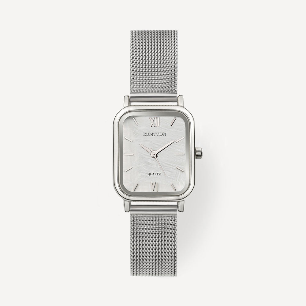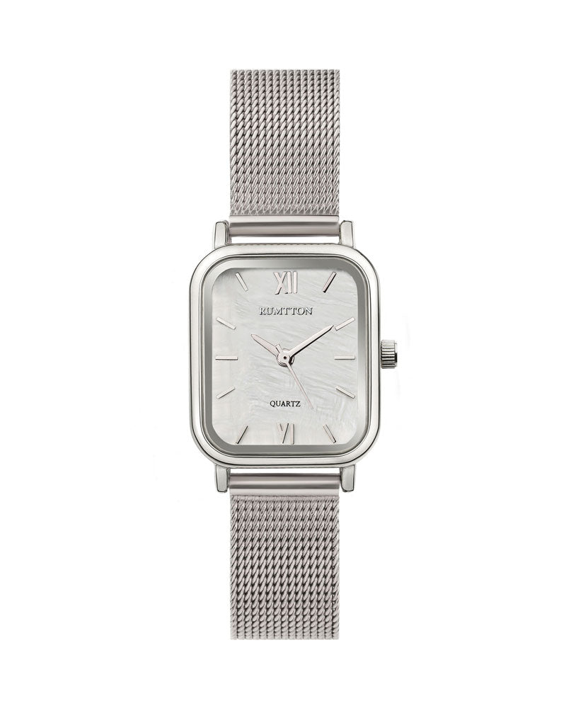 The RUMTTON HARBOR Silver watch features a luminous white mother-of-pearl dial that adds timeless elegance to any ensemble. The comfortable mesh band ensures effortless style for everyday wear.