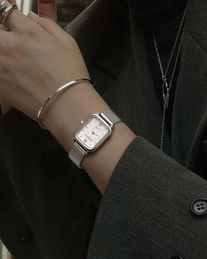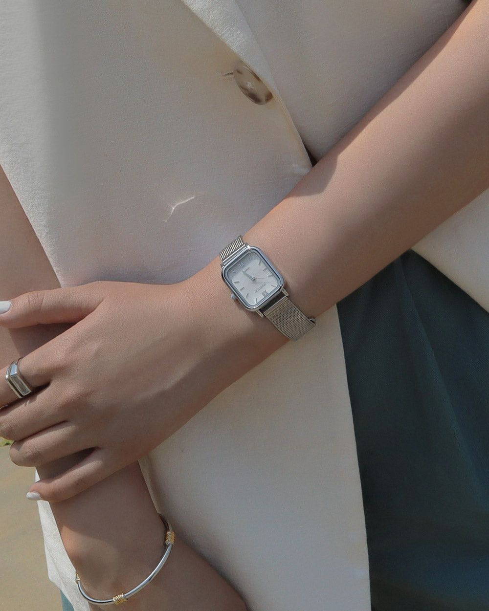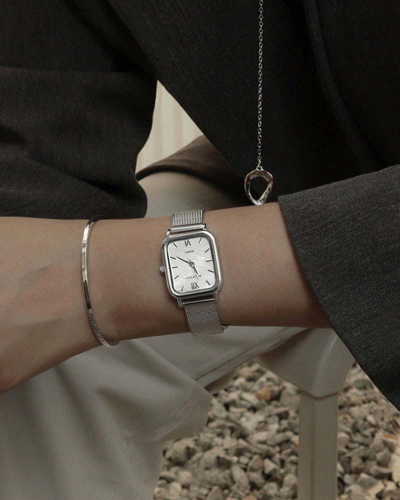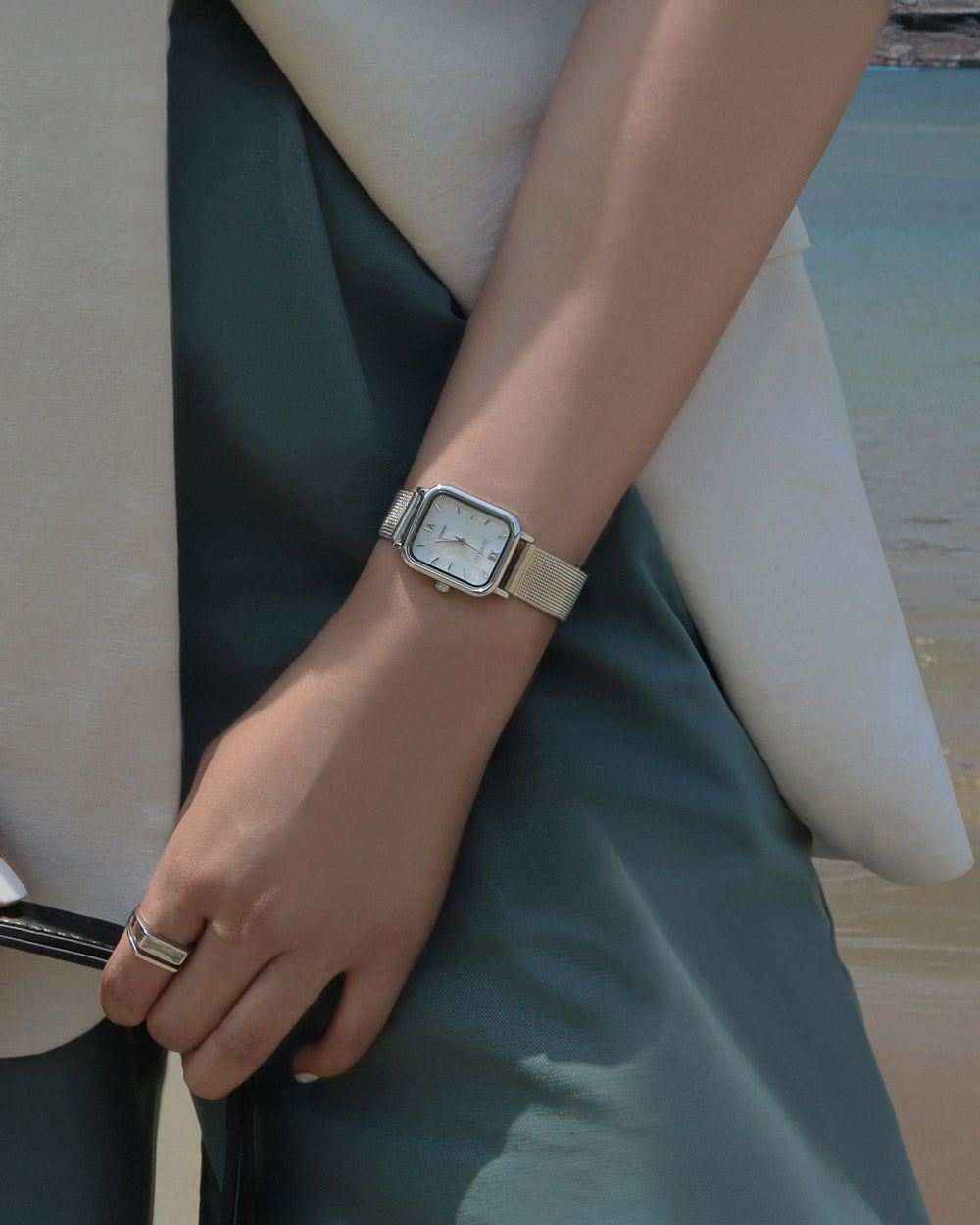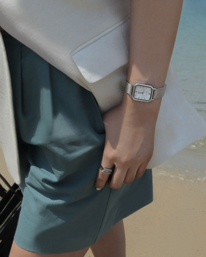 The RUMTTON HARBOR Silver watch features a luminous white mother-of-pearl dial that adds timeless elegance to any ensemble. The comfortable mesh band ensures effortless style for everyday wear.